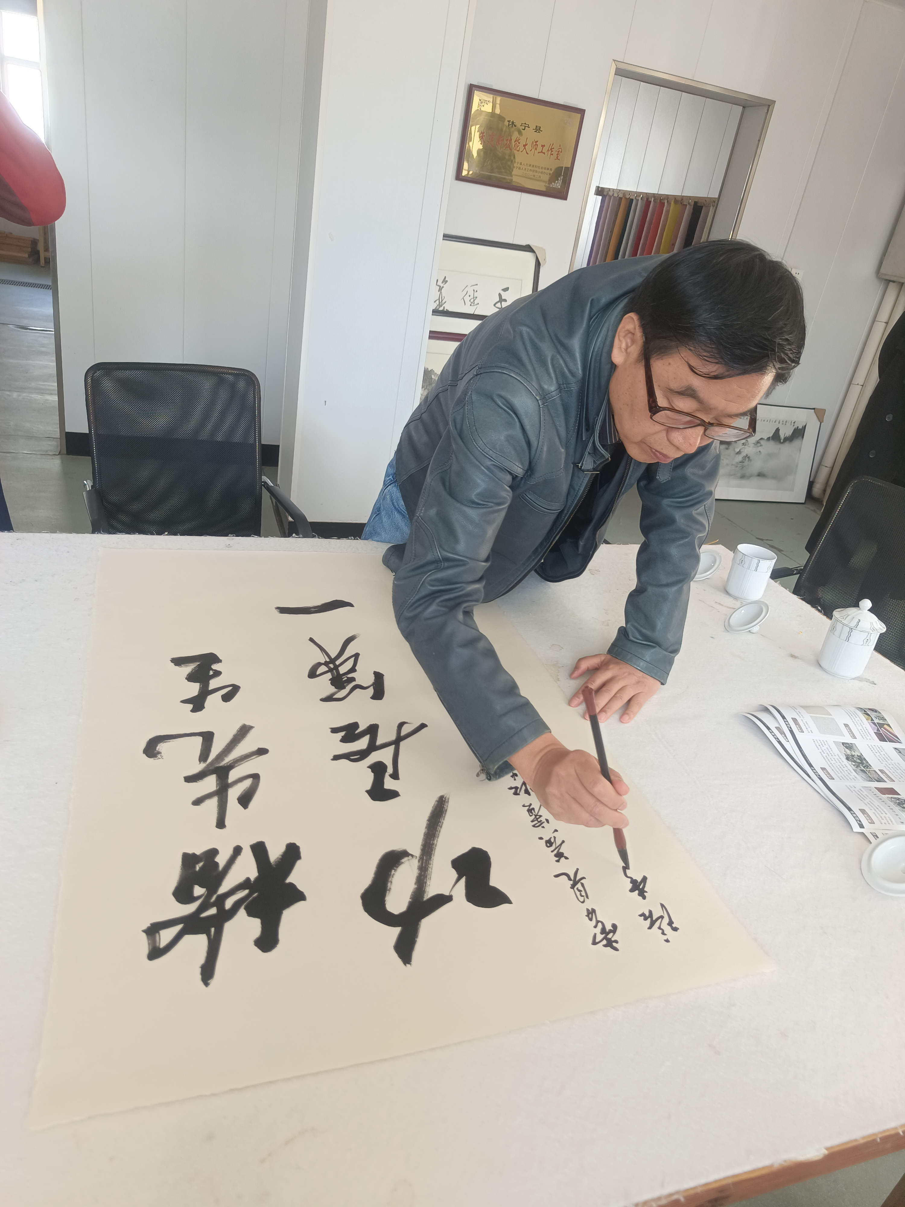 近距離觀摩大師創(chuàng)作,著名畫家李庚老師和著名文化學(xué)者、書法家王魯湘老師抽出寶貴時(shí)間來公司指導(dǎo)試筆,并為我們留下三幅珍貴墨寶,這是對我們做徽州皮紙的肯定,也是對我們的鞭策,使我們更有信心堅(jiān)守敬畏之心,匠人精神,做出更好的徽州皮紙。感謝安徽書法協(xié)會(huì)會(huì)長王云龍全程陪同